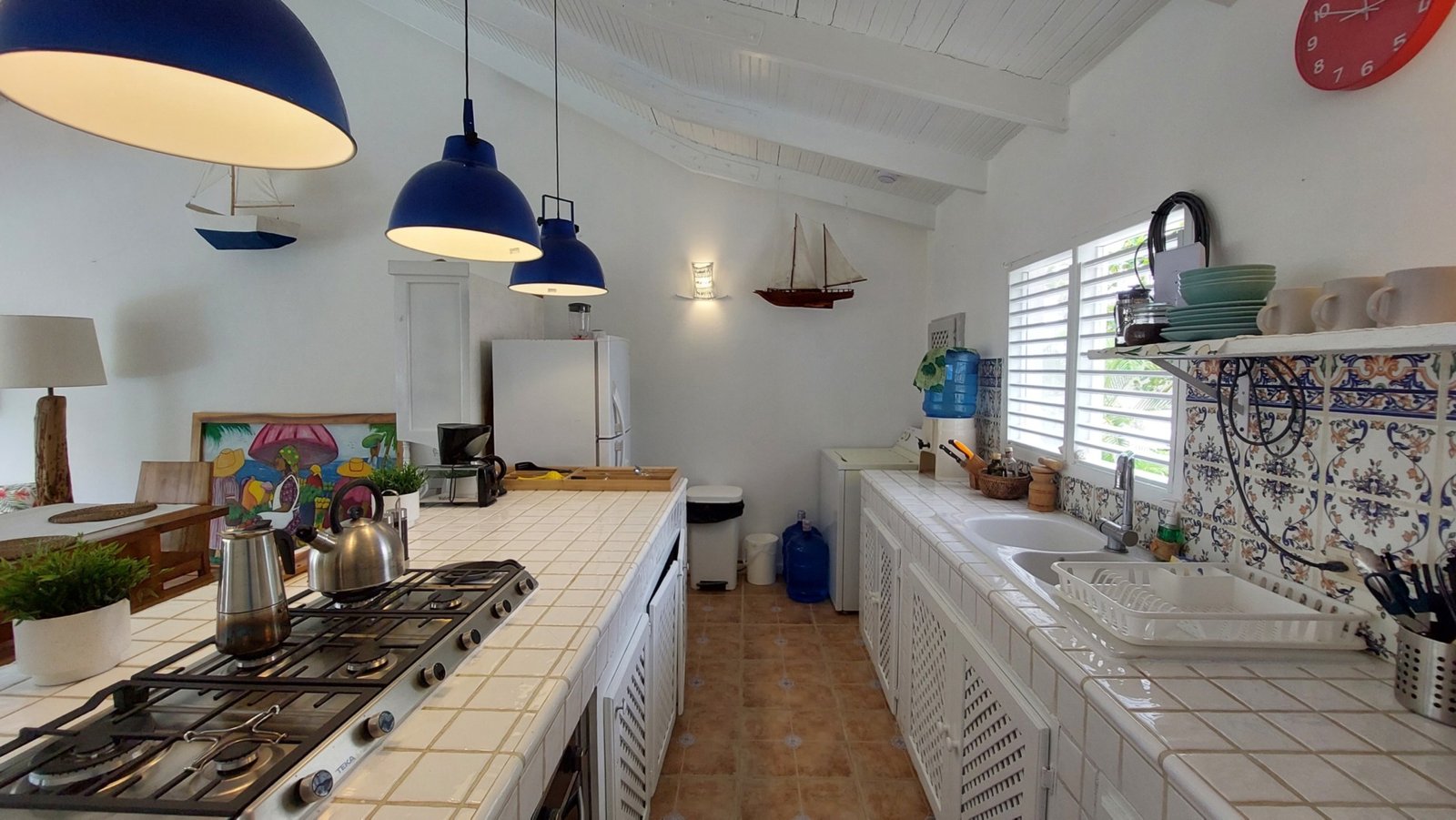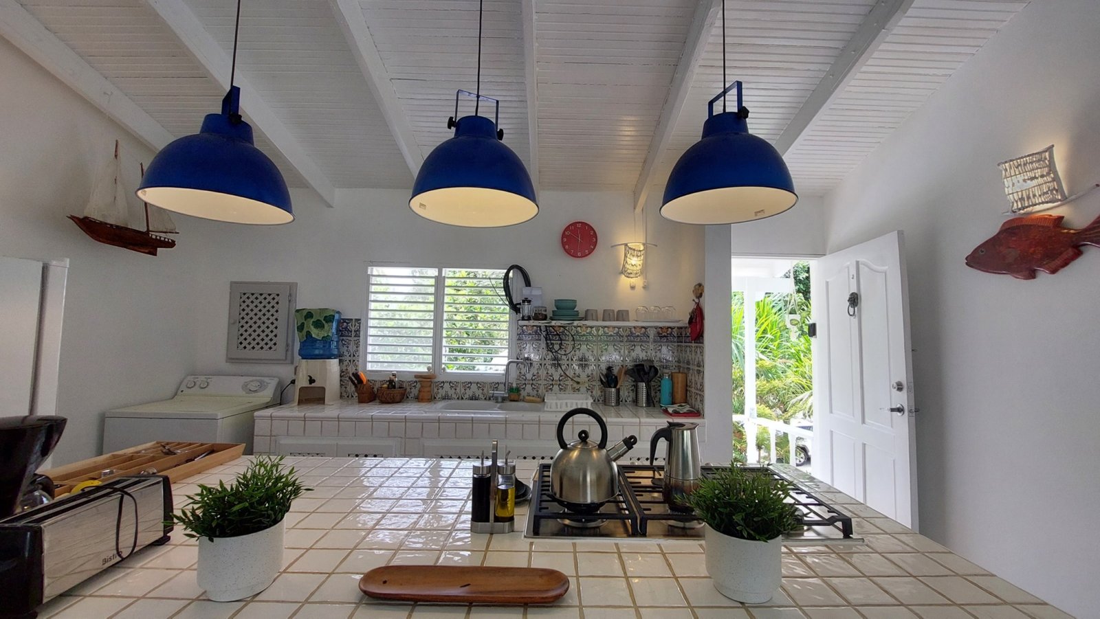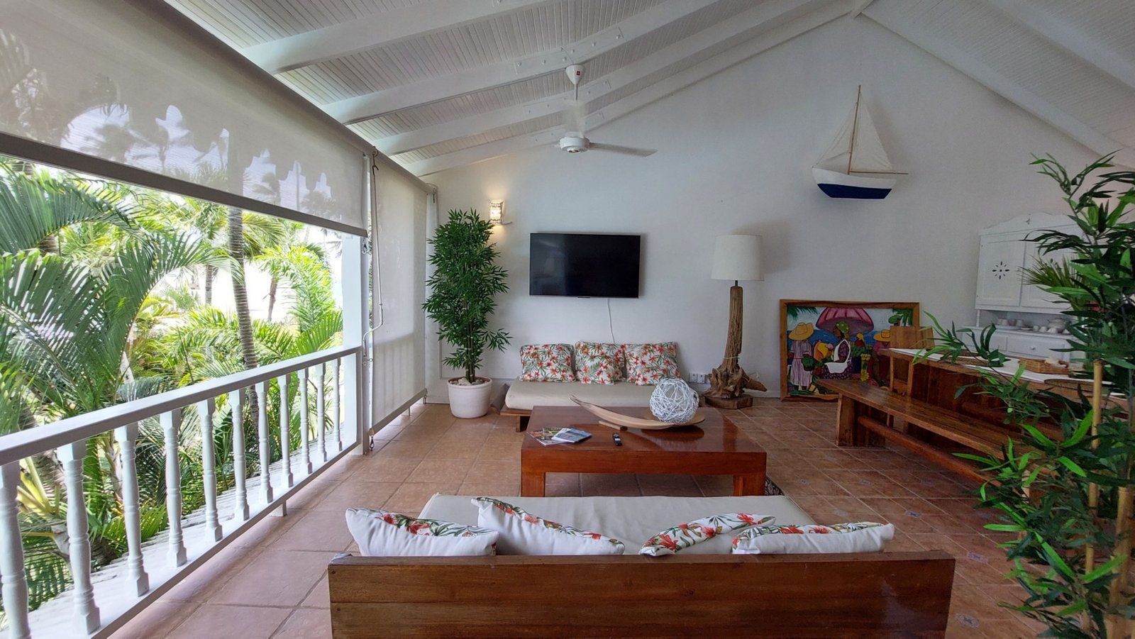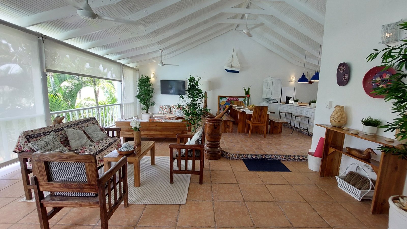 The open living and dining area features a Smart TV (Netflix & Apple TV), three ceiling fans, and a fully equipped kitchen with a center island. Shutters allow for privacy while maintaining the breezy, open-air Caribbean feel.