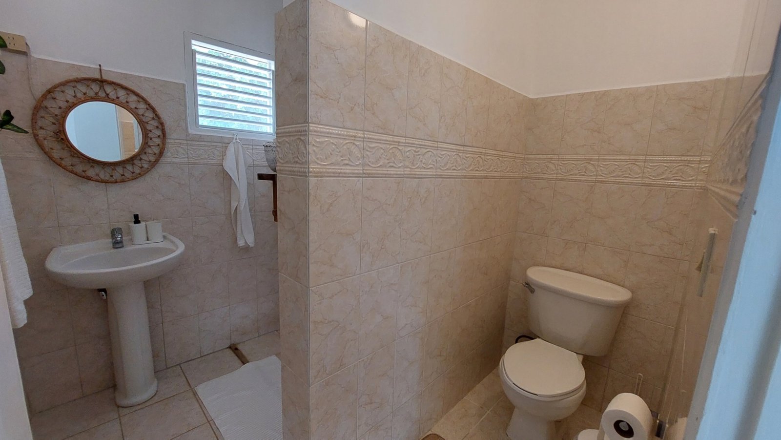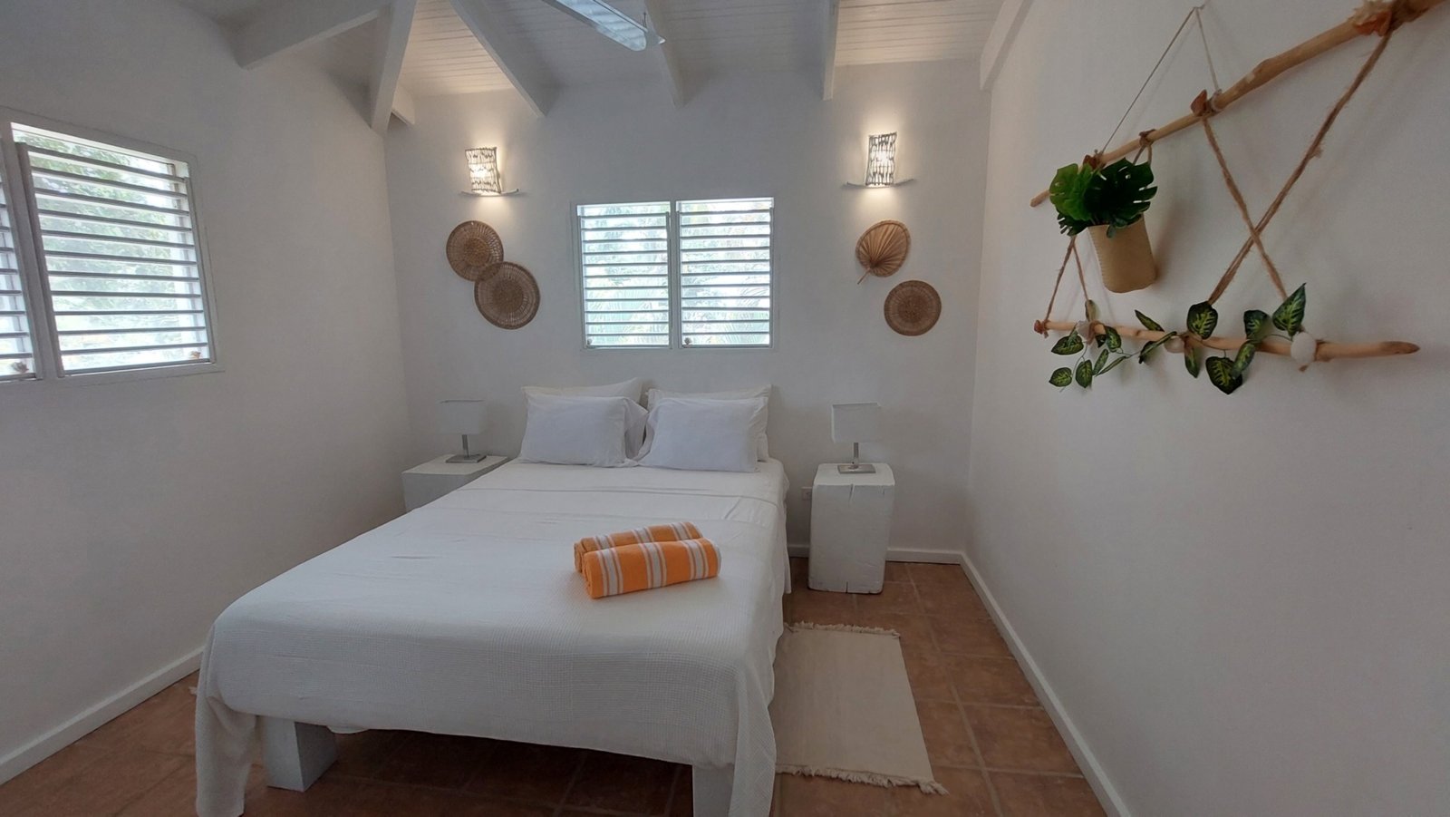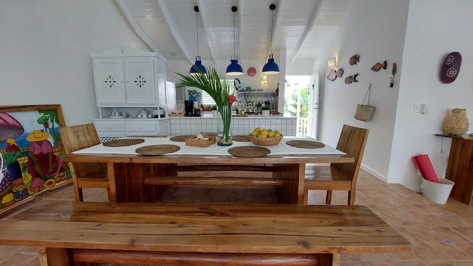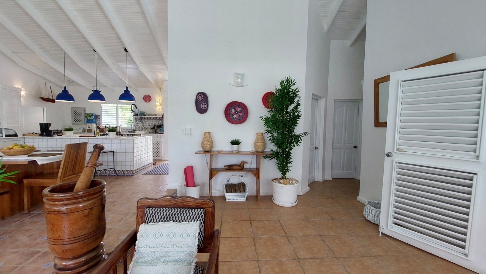 The open living and dining area features a Smart TV (Netflix & Apple TV), three ceiling fans, and a fully equipped kitchen with a center island. Shutters allow for privacy while maintaining the breezy, open-air Caribbean feel.