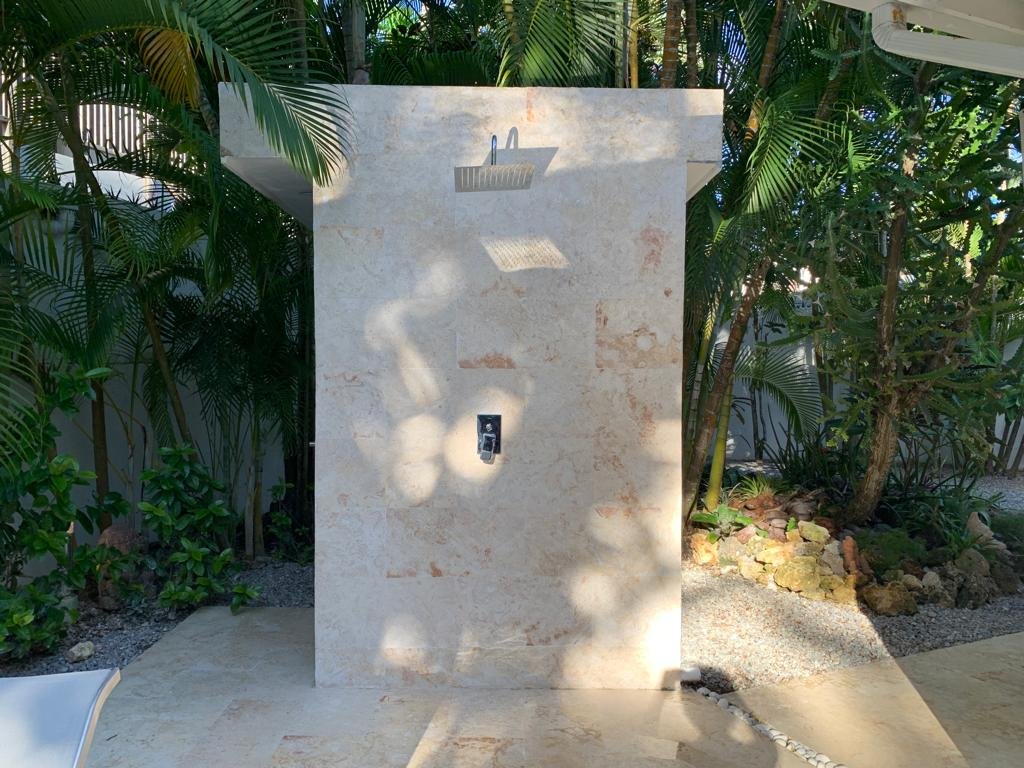 • Exterior coral-stone shower and bathroom