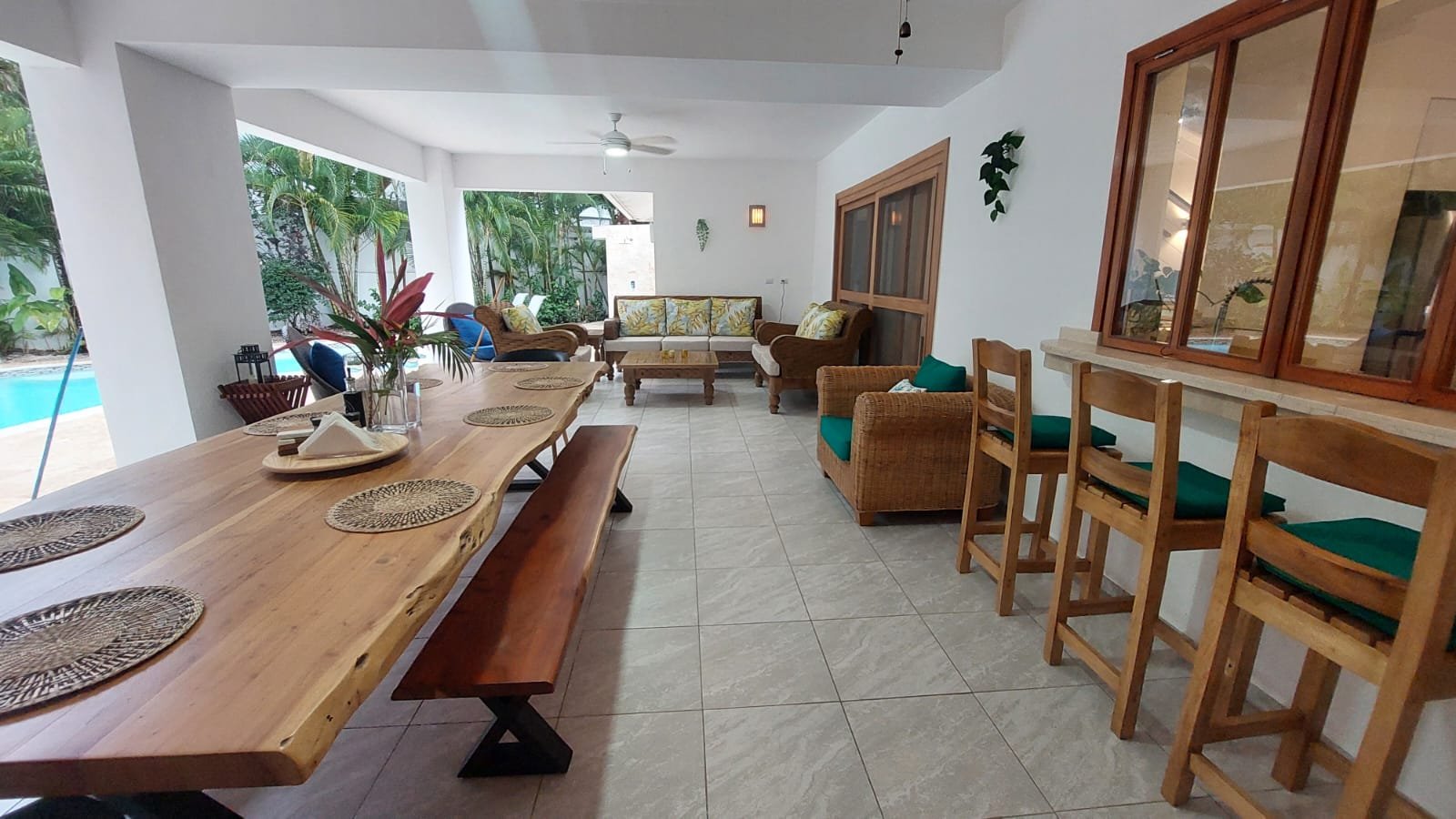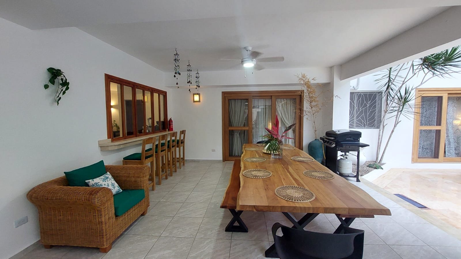 • Covered terrace with BBQ, seating area, and dining space